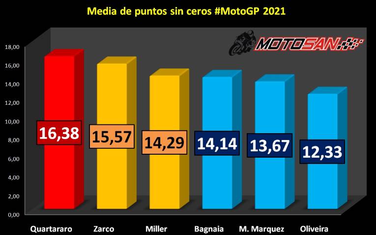 ¿Qué pilotos suman más puntos medios eliminando sus ceros? El campeonato es justo en el TOP 4 con Quartararo, Zarco, Miller y Bagnaia en lo más alto. Sorprende que vemos a Marc Márquez en quinto lugar, ya que no pudo correr las dos primeras carreras y luego cayó en otras tres, con 41 puntos en tres carreras puntuadas. Cierra este TOP 6 Oliveira. Podemos confirmar la justicia del actual liderato de Fabio Quartararo en MotoGP.