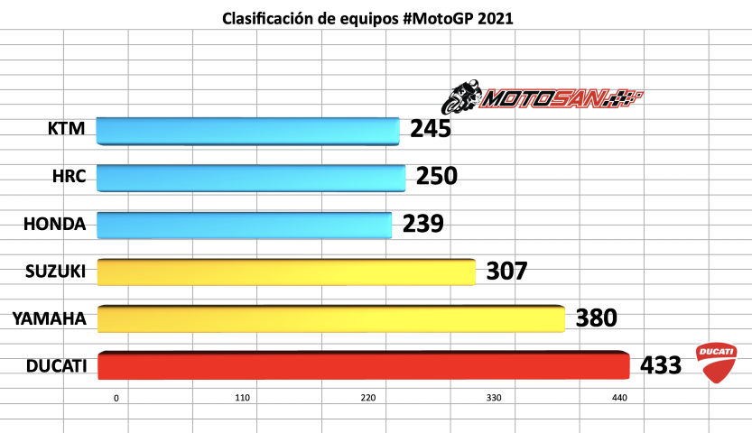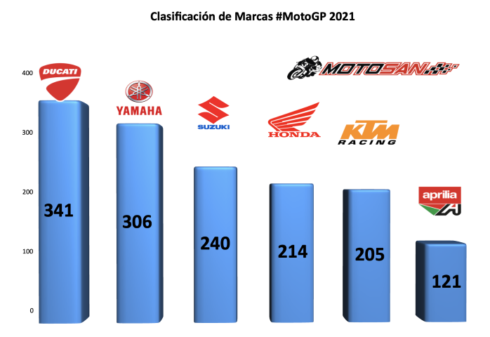 El título ya estaba cerrado desde Portimao y, con la cita en Valencia, la situación no cambia. Ducati se lleva la corona, seguido por Yamaha y Suzuki, que completa el podio pese a no haber firmado una temporada muy sencilla. La situación en Honda, pese a ser crítica, salvan un cuarto puesto, por delante de KTM y Aprilia que, pese a firmar su primer podio en su historia, acaba como la última marca de las seis que completan la parrilla de MotoGP.