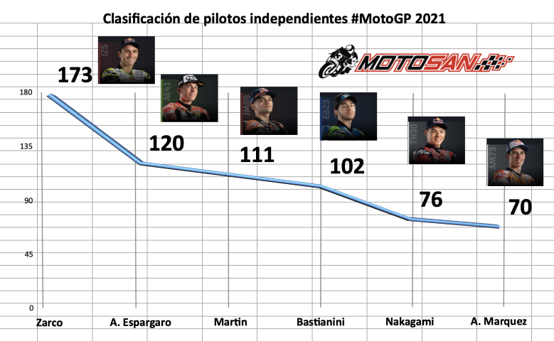 Otro Mundial que estaba cerrado. Pramac y Zarco se proclamaron campeones de los independientes en las anteriores carreras, con Aleix Espargaró en segunda plaza. Lo que sí cambia es el podio porque, con su segundo puesto, Jorge Martín cierra con la tercera plaza y desplaza a Enea Bastianini hasta la cuarta posición de esta clasificación. Tras el italiano, Nakagami gana por seis puntos a su compañero de equipo, Álex Márquez.