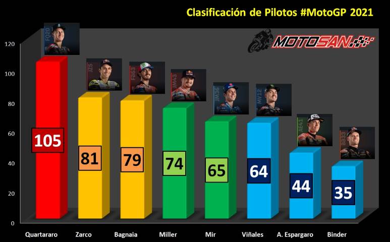 Zarpazo a la clasificación de Quartararo en Mugello, un circuito que se adapta a su estilo a las mil maravillas. Ninguno de sus más directos rivales acabó en el podio, quedando ahora Zarco a +24, Bagnaia a +26 y Miller a +31. Las Ducati, que esperaban un gran resultado en casa, se van de vacío. Por su parte Mir, tras la caída en Le Mans, ha vuelto al cajón. El TOP 6 de los aspirantes al título lo cierra Viñales, que tuvo de nuevo otra carrera para olvidar.