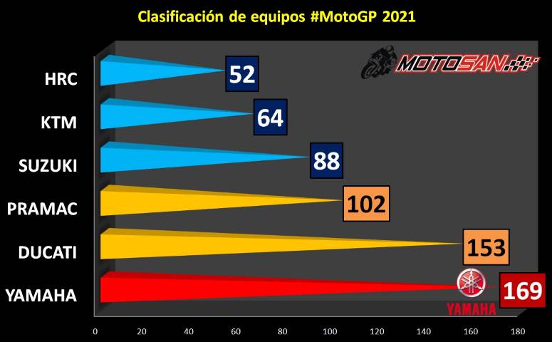 En las clasificación por equipos Yamaha vuelve a ponerse en cabeza, arrebatando esa posición a Ducati. La victoria de Quartararo ha sido clave para ello, mientras que Viñales ha aportado 8 puntos. Ducati oficial esta vez salió mal parada por la caída de Bagnaia y el sexto lugar de Miller. Esto parece cosa de dos, con Pramac como mejor equipo privado entre el resto de oficiales.