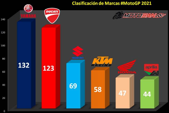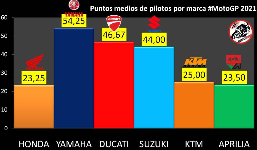 Pese a los malos resultados de Valentino Rossi y el bajo nivel de Morbidelli o Viñales, la Yamaha sigue siendo la mejor moto por resultados medios de sus pilotos con 54,25 puntos. Los pilotos de Ducati y Suzuki tienen medios para intentar plantarles cara. Por contra, KTM (pese al podio de hoy), Honda y Aprilia tienen que seguir evolucionando sus motos para acercarse a sus rivales.