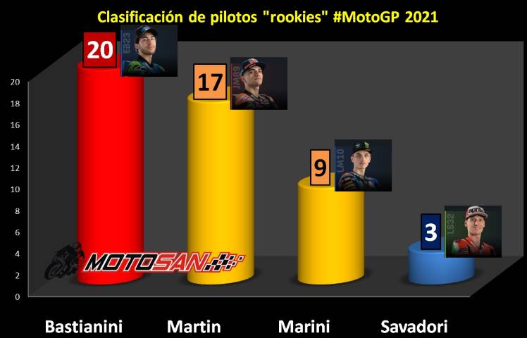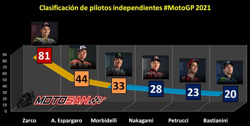 En la clasificación de los pilotos en equipos independientes (o «satélites») nos encontramos claramente destacado a Johann Zarco con 81 puntos. No en vano es segundo en la clasificación general, el único piloto en equipo no oficial que está mezclado con los oficiales. Por detrás meritorios 44 puntos de Aleix Espargaró con el Aprilia Gresini y decepcionante lugar del actual subcampeón de MotoGP, Morbidelli con una Yamaha de 2019. Sin apoyo de la fábrica es difícil, pese a merecerlo como el italiano.
