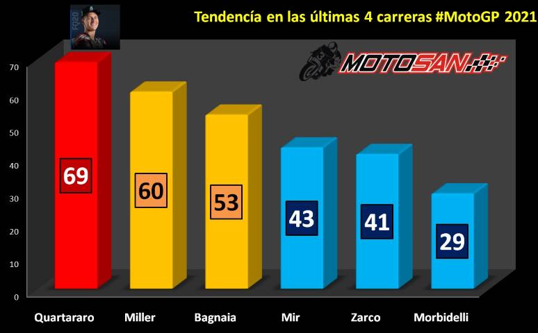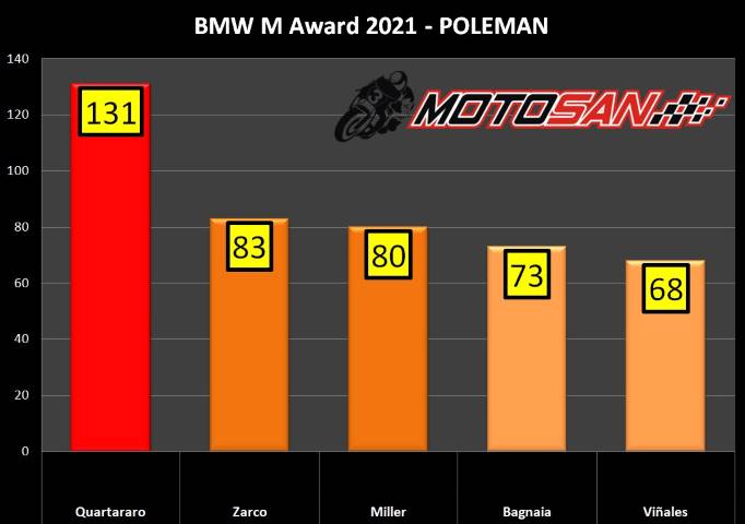 Cuatro poles consecutivas; Fabio Quartararo domina esta clasificación de los mejores en entrenamientos aún con más fuerza que la clasificación del campeonato de MotoGP. Le siguen Zarco con 83, Miller con 80, Bagnaia con 73 y Viñales con 68. El de Roses debe mejorar en este apartado si quiere plantar cara a su compañero de equipo.