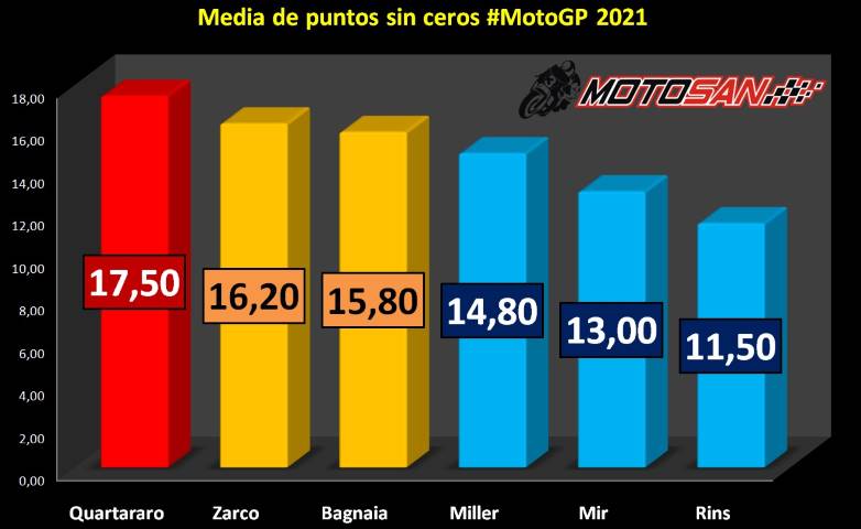 ¿Cuál es el piloto más rápido si eliminamos los ceros y hacemos la media en base a las carreras acabadas? Quartararo, lo que demuestra que la actual clasificación, al menos en el TOP 5 de la general, es justa. Lo único que llama la atención es el caso de Rins, que es el 6º piloto si eliminamos sus ceros, pero es que acumula cuatro en cuatro caídas consecutivas mientras luchaba por posiciones delanteras.