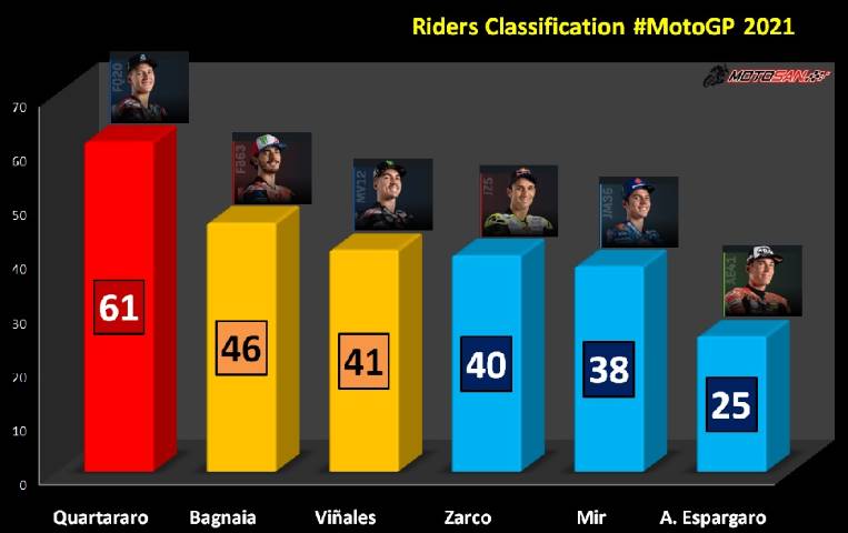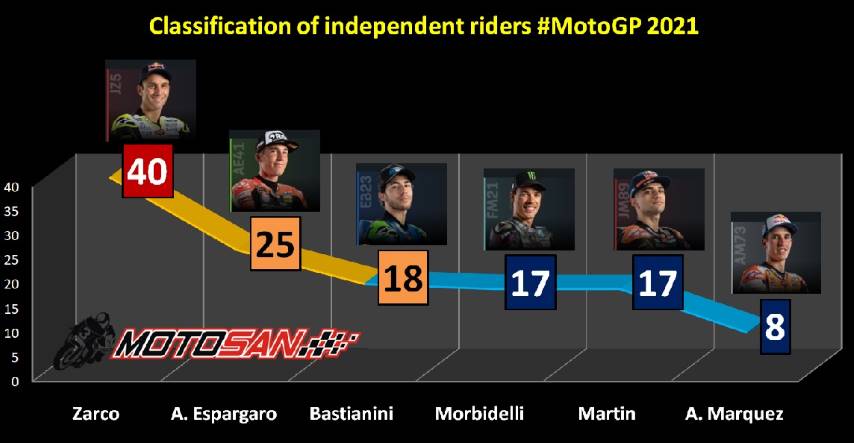 Duro varapalo para Johann Zarco, que cayó cuando era tercero. Pese a perder el liderato en la clasificación provisional, sigue siendo el piloto satélite más destacado con diferencia. Tras él un sorprendente Aleix Espargaró que hoy ha logrado ser sexto con la Aprilia Gresini. Morbidelli, que hoy ha rozado el podio, vuelve a sonreír y buscará en Jerez seguir la tendencia. Los «rookies» Bastianini y Martin están en el TOP 5 pese a que el español se ha perdido la carrera por lesión. Mañana será operado en Barcelona.
