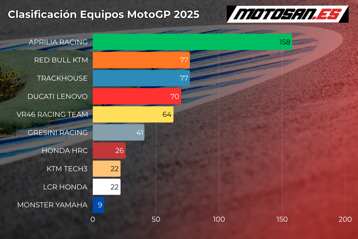 Aprilia sigue liderando la clasificación de MotoGP tras Estados Unidos en lo que a equipos se refiere. Sus resultados de este fin de semana les ayudan a seguir aumentando la ventaja en la tabla de puntos, que ya aumenta hasta 81. KTM ha adelantado a Trackhouse, aunque ambos están empatados a puntos. Siete puntos por detrás aparece el Ducati Lenovo, en cuarta posición. El VR46 Racing Team cierra el top five de equipos en la clasificación de MotoGP, 6 puntos por detrás de Ducati.