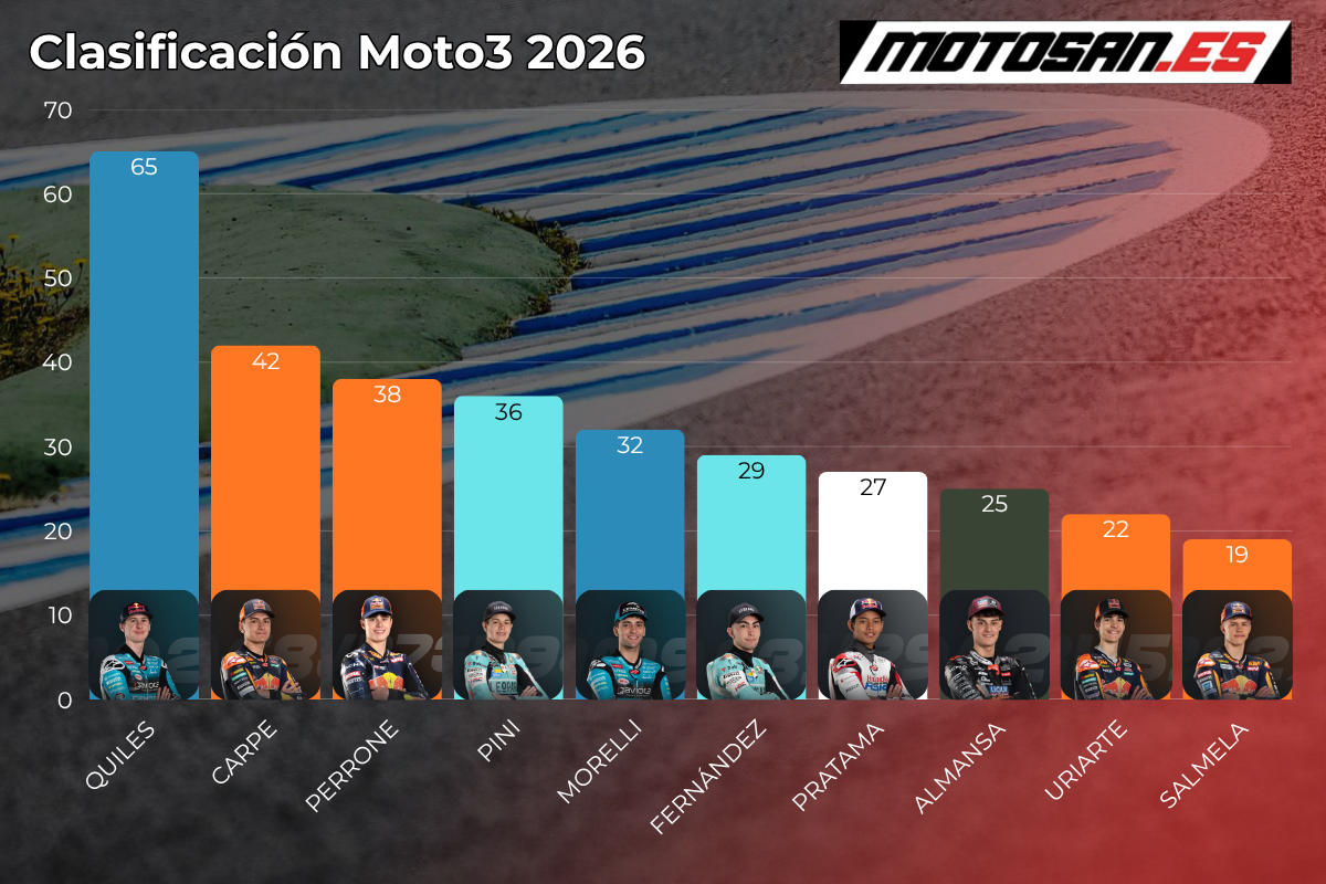 Pecco Bagnaia, que terminó segundo, ha mejorado hasta subir a la quinta posición. Raúl Fernández, séptimo, también ha perdido una posición en esta tabla de puntos y ahora se sitúa séptimo, por delante de Álex Márquez. Marco Bezzecchi ha sumado sus 6 primeros puntos en sábado y se sitúa noveno, por delante de Brad Binder, que pierde dos posiciones y cierra el top ten.