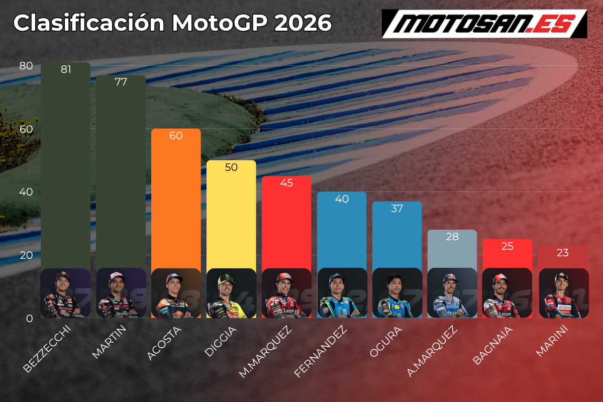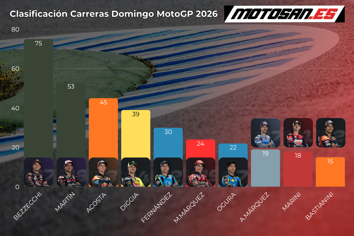Teniendo en cuenta la clasificación de MotoGP tras Estados Unidos sumando solo los puntos de las carreras del domingo, Marco Bezzecchi es el líder de la tabla. El italiano ha ganado las tres carreras largas de esta temporada. Por detrás, pocos cambios con respecto a la clasificación general. Jorge Martín, Pedro Acosta y Fabio Di Giannantonio son los pilotos que le siguen, siendo los más regulares en las posiciones delanteras en este arranque de temporada.