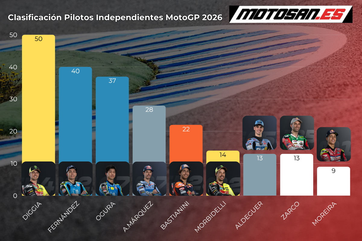 Franco Morbidelli ha perdido una posición tras el ascenso en la clasificación de Bastianini y se sitúa sexto. Fermín Aldeguer mantiene la séptima posición, por delante de Johann Zarco. El francés ha caído de la sexta a la novena plaza. Diogo Moreira cierra el top ten en esta clasificación de pilotos independientes.