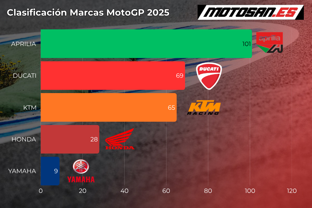 Aprilia es la clara dominadora de la clasificación de MotoGP tras Estados Unidos en cuanto a marcas. Los italianos acumulan 32 puntos más que Ducati, que en este arranque de temporada ocupa la segunda posición. Una plaza que amenaza KTM, tercera a solo 4 puntos de los de Borgo Panigale. Muy por detrás de KTM, aparecen Honda y Yamaha, estos últimos con evidentes problemas.