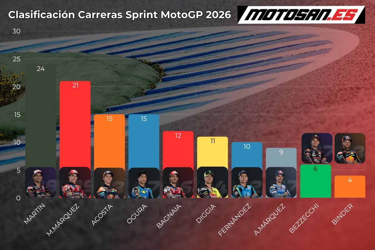 Quien se hizo con la victoria ayer en la Sprint Race fue Jorge Martín. ‘Martinator’ volvió a lo más alto del podio desde que lo hiciese por última vez a finales de 2024. Así, con los 12 puntos sumados en la carrera de ayer, se sitúa líder de la clasificación de MotoGP 2026 tras Estados Unidos en lo que a Sprint Race se refiere. El madrileño ha ido paso a paso, punto a punto, subiendo desde la quinta posición con la que comenzó en Tailandia a la primera de Estados Unidos.