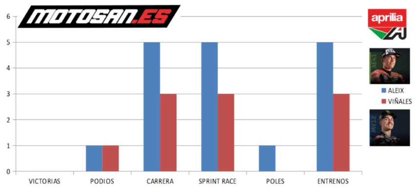 La dinámica se mantiene también en las clasificaciones de cara a la parrilla de salida. Espargaró ha marcado mejores registros que Viñales también en cinco de las ocho carreras disputadas. Además, pudo hacerse con la pole en el Gran Premio de España, en Jerez. Sin embargo, las cosas no fueron bien para el piloto en las carreras: no pudo terminar la Sprint debido a una caída, y cruzó la línea de meta en quinto lugar el domingo.