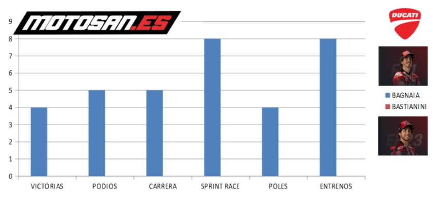 El italiano ha demostrado además su superioridad tanto en carrera Sprint como en la carrera del domingo. Tanto es así, que la única forma de encontrarle fuera del podio es por caída. Bagnaia ha acumulado un total de siete victorias, tres en Sprint y cuatro más en Gran Premio; sumando doce podios en las ocho citas disputadas. Además, el piloto ha salido desde la pole en cuatro ocasiones esta temporada.