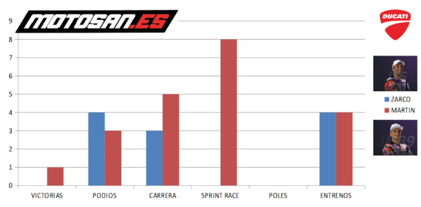 En general, Jorge Martín ha logrado superar a su compañero de equipo en carrera en un total de cinco ocasiones; frente a las tres en las que el francés se impuso al español. No obstante, a pesar de que es un piloto de sábados, y que ya desde su año de rookie en la categoría reina había salido desde la primera posición de la parrilla; esta temporada parece que la pole se le resiste. En su lugar, Martín y Zarco se encuentran empatados en cuanto a sus registros en las clasificaciones de las primeras ocho citas de la temporada.