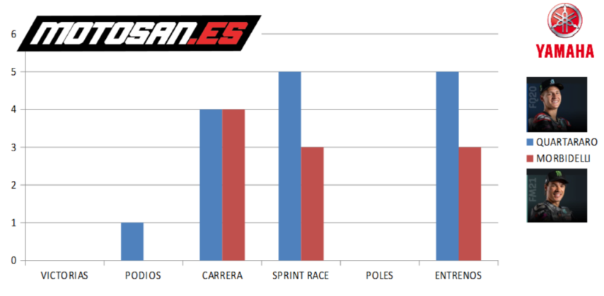 En cuanto al número de victorias esta temporada, ninguno de los pilotos de Yamaha ha conseguido subir a lo más alto del cajón; ni en carrera Sprint ni en carrera larga. En cambio, Fabio Quartararo logró subir al podio, en tercera posición, en el Gran Premio de las Américas. Morbidelli, por su parte, se quedó a las puertas del podio en el Gran Premio de Argentina; su mejor resultado logrado hasta el momento.