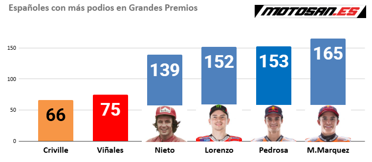 Por delante de Martín aparece una lista que impone respeto. En lo más alto, inalcanzable por ahora, está Marc Márquez con 165 podios, seguido por dos mitos como Dani Pedrosa (153) y Jorge Lorenzo (152). También figuran nombres clave de distintas generaciones: Maverick Viñales (75), Álex Crivillé (66), Álex Rins (58).