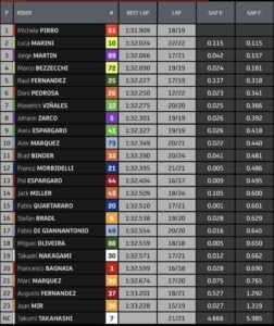 Pero la gran sorpresa de los primeros minutos de los libres fue el otro Wild Card del fin de semana, Pirro, que corre para Ducati. El piloto italiano ha estado dominando gran parte del tiempo en el FP1 en la primera mitad y finalmente ha conseguido pasar en primera posición, siendo la primera Ducati, seguido por dos más, Luca Marini y Jorge Martín.