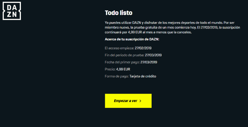 Al meter este dato, puedes continuar, ves el resumen, le das a «Empezar a ver» y… ¡Ya está! Ya puedes acceder para disfrutar de MotoGP, entre otros deportes.