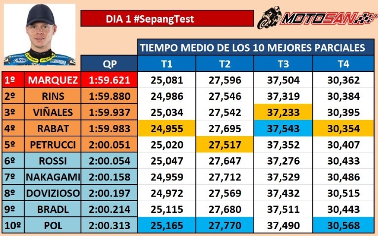 Ahora cojamos de cada piloto los 10 mejores tiempos de los 4 parciales de forma independiente, hagamos la media, para después sumarlos y darnos una vuelta referencia de cada uno. Este dato demuestra que Marc Márquez aún no está a buen nivel físico. Ha sido el más rápido, pero ha dado pocas vueltas, lo que demuestra que no tiene aún un ritmo sostenible para aguantar la carrera.