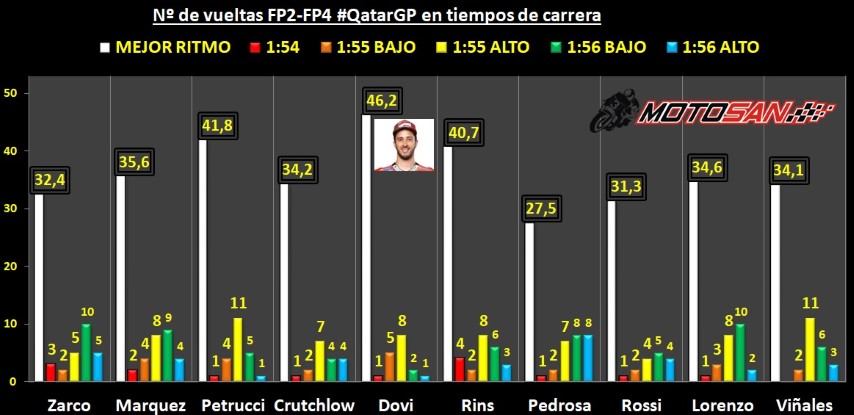 Dovizioso, como en él es habitual, ha dado menos vueltas que sus rivales. Lo tenía claro tras los test hace dos semanas en esta misma pista y cada vez que ha salido ha marcado de inmediato un ritmo muy alto. Lo raro es verle rodar en 1:56, con 13 vueltas en 1:55. Tan sólo se le aproximan en ritmo su compañero de marca Petrucci y Rins, con Suzuki, que está confirmando su alto nivel mostrado esta pretemporada. Aunque los datos reflejan una igualdad absoluta, que haya habido test recientemente aquí es algo que favorece que con el tiempo suficiente todos lleguen a su máximo.