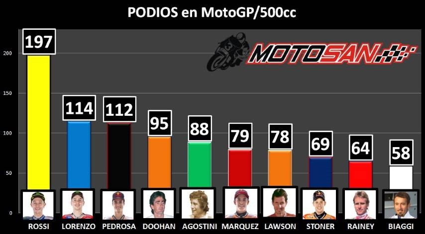 En lo referido sólo y exclusivamente a la categoría reina (MotoGP/500cc), Valentino Rossi sigue siendo el rey y con una gran diferencia. En unas carreras podría llegar al número redondo de 200 podios en MotoGP. Si para la mayoría ya es un sueño llegar ahí al menos una vez en la vida, Valentino tendrá muchas anécdotas que contar a sus nietos acerca de sus éxitos.