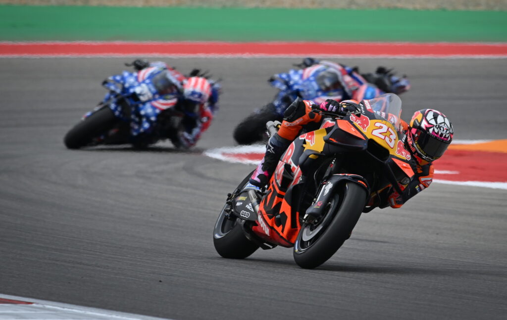 El de KTM confesó que intentó dar el paso adelante en los compases finales. «Para ser honesto, intenté estar mucho más cerca al final de la curva 11 para intentar adelantarlo en la 12, pero nada. Nos faltó un poco de aceleración. Por lo demás, fuimos competitivos sobre todo en frenada».