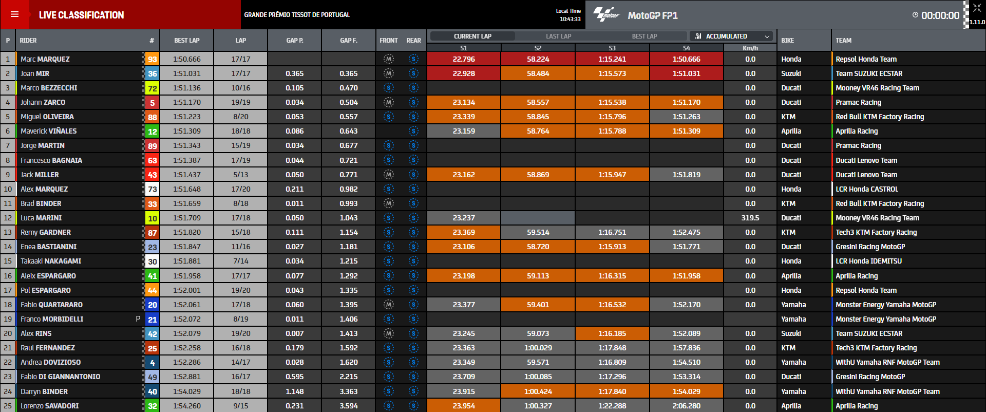 Al cabo de aproximadamente un cuarto de hora se producía un primer accidente, un choque a alta velocidad de Takaaki Nakagami en la curva 9, sin consecuencias. En Suzuki, según ha declarado Livio Suppo a motogp.com , primera vuelta con pruebas también en el dispositivo de descenso para recoger información incluso bajo la lluvia, algo que no se había hecho en Mandalika. Marco Bezzecchi ha estado en lo más alto durante aproximadamente la mitad de la sesión, mientras que a unos minutos del final su compañero de marca, Jack Miller, se iba al suelo. En los últimos compases todo el mundo trataba de terminar al frente, Luca Marini se iba al suelo. Poco antes Marc Márquez había tomado la delantera, manteniéndolo así hasta la bandera a cuadros.