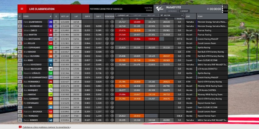 Finalmente, las Yamaha han mantenido su dominio en el trazado de Mandalika. Por detrás se han situado los pilotos del Pramac Ducati Johann Zarco y Jorge Martín. El líder del campeonato, Enea Bastianini, ha mantenido la quinta posición a pesar de su caída, seguido por la Ducati de Jack Miller y la Aprilia de Aleix Espargaró. Brad Binder, Miguel Oliveira y Álex Rins han cerrado el Top10 de la segunda sesión de libres del viernes.