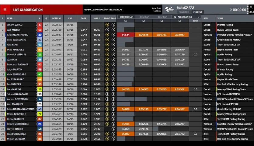 En el último tercio de la ronda, Rins se ha mantenido imbatible en lo más alto de la tabla. Sin embargo, Miller se ha visto relegado a la tercera posición por su compañero de equipo Pecco Bagnaia. Fabio Quartararo ha subido hasta la cuarta posición, tras las Ducati oficiales y por delante de las Aprilia de Viñales y Espargaró.