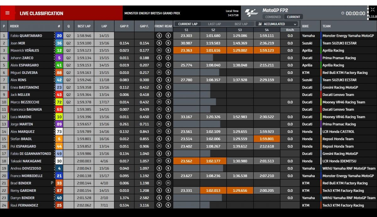 Las Suzuki y las Aprilia, un claro paso adelante. Y es que dichas dos fábricas han colocado a sus cuatro pilotos entre los siete primeros. Cabe descartar, entre todos, la segunda posición de Joan Mir. El mallorquín busca reivindicarse en tierras inglesas y su tiempo final lo corrobora. Justo por detrás está un Maverick Viñales que también mantiene sus buenas sensaciones; Aleix Espargaró sigue arriba, quinto; Álex Rins, séptimo.