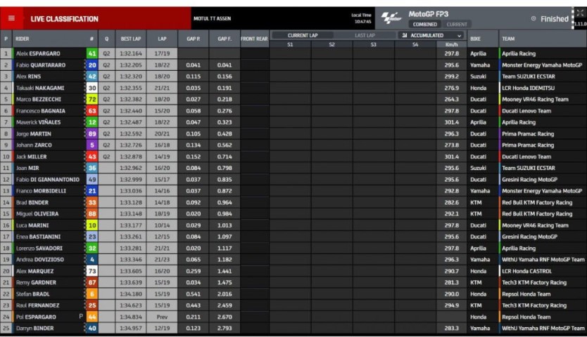 Lo que sucedió durante la jornada de ayer no sirvió de absolutamente nada. Con condiciones completamente opuestas a lo vivido durante el viernes, los pilotos de MotoGP disfrutaron de una sesión completamente en seco. Una sesión que se antojaba clave para todos, ya que en la FP3 se decidiría 100% qué pilotos estarían directamente en la Q2. Aleix Espargaró se aseguro la presencia ahí. El piloto de Aprilia sigue dando pasos adelante con la moto, colocándose en Assen como el más rápido. Es más, las dos Aprilia van realmente bien en dicho trazado. Y es que si Aleix está primero, Maverick Viñales se encuentra en la séptima posición tras anularle una vuelta. Aún así, Assen es un circuito que a Viñales le va muy bien, y este fin de semana podríamos verlo luchando por un podio. En segunda posición se encuentra Fabio Quartararo y detrás, Álex Rins.