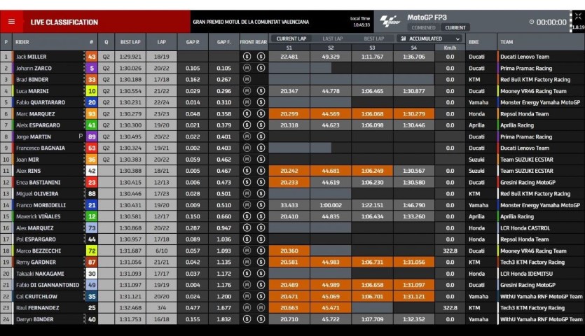 Con el paso de los minutos se podía intuir algo de nerviosismo entre los dos contendientes al título. Y es que tanto Bagnaia como Quartararo protagonizaron momentos tensos o de dudas encima de sus motos: salidas de pista, enfados con otros pilotos, etc. A nivel de la combinada general creada este viernes, muy pocos cambios en la clasificación.