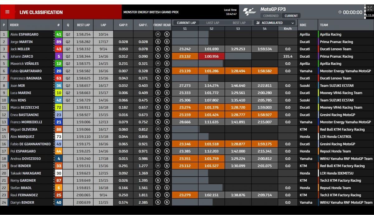 La acción ha regresado al trazado de Silverstone en la mañana del sábado con la tercera sesión de entrenamientos libres. Los pilotos de MotoGP no han tardado en salir a la pista; con Fabio Quartararo marcando el tiempo de referencia del viernes. La sorpresa llegó de la mano de Joan Mir, que logró dar un paso adelante con Suzuki y finalizar en segundo lugar.