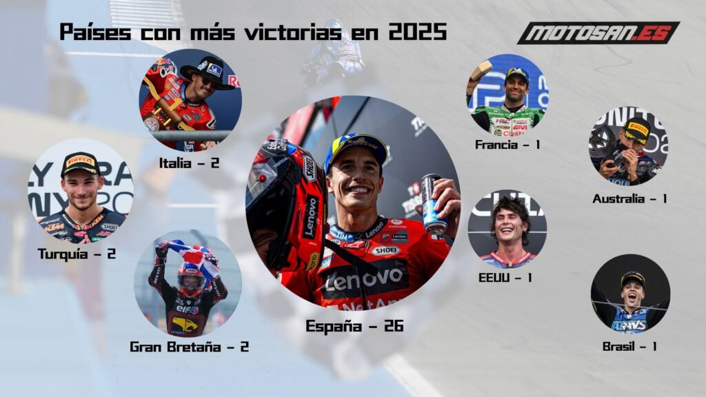 En los últimos años, MotoGP ha vivido un dominio claro por parte de pilotos de dos nacionalidades: española e italiana. Ambos países se han repartido los triunfos a lo largo de los Grandes Premios del calendario. Sin embargo, en esta primera mitad de la temporada 2025, nuestro país ha destacado muy por encima del país alpino.