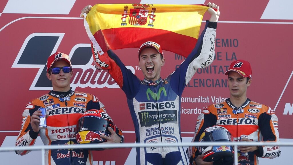 Lorenzo hizo la pole de su vida y tal cual empezó la carrera primero, primero la acabó, sosteniendo a Marc Márquez y Pedrosa justo detrás de él. Rossi, por su parte, logró remontar hasta la cuarta posición, pero debido a que Jorge hizo la carrera perfecta, quedó por solo cinco puntos detrás del español en la clasificación general. De hecho, Lorenzo asegura que ese título fue una gran liberación y cuenta como fue esa celebración la cual entendió que era muy importante: «La fiesta del domingo después de Valencia fue increíble, con los años entendí que debía disfrutar los momentos, porque puede que no vuelvan. Es importante disfrutar cuando ganas, cuando subes al podio y, por supuesto, cuando ganas un campeonato, hay que disfrutarlo al máximo con los amigos y con el equipo. Esto es lo que hice en los últimos cinco años de mi carrera, después de cada carrera, fiesta en mi motorhome, fiesta por la noche. Entrenaba muy en serio durante la semana, pero cuando llegaba un buen resultado, también celebraba a lo grande«.