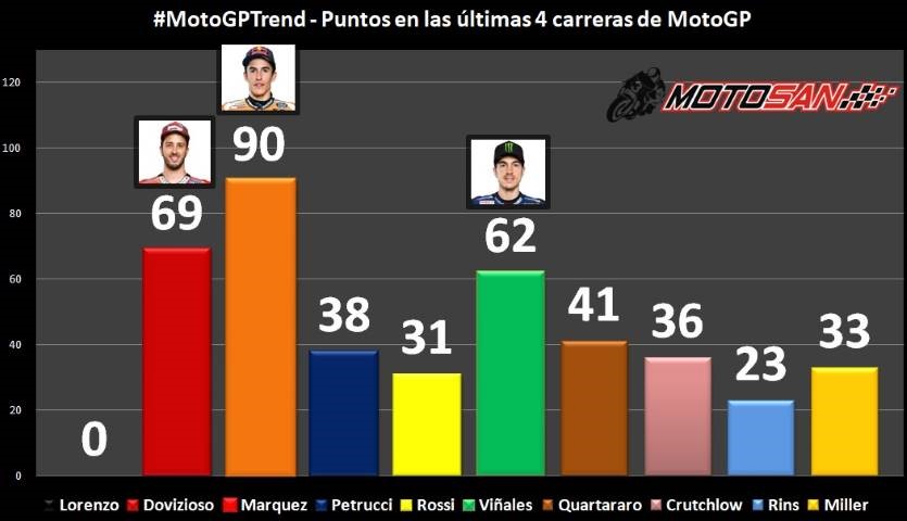 Pese a ser hoy la tercera Yamaha, Maverick Viñales ha sido el mejor piloto de la marca en estas últimas cuatro citas sumando 62 puntos. Bastante por delante de Rossi, con 31 que empieza a recuperar sensaciones, y Quartararo con 41 pese a que el francés lleva dos podios en este intervalo de carreras. Como decía, el liderazgo en la marca de los diapasones está en juego.