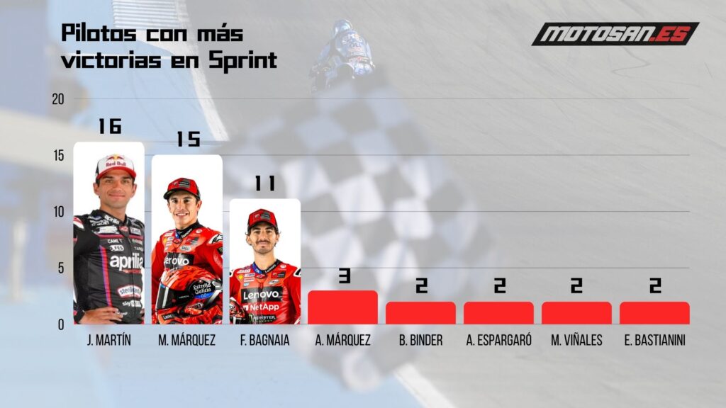 Desde que llegasen las carreras cortas, Jorge Martín ha sido bautizado como ‘el hombre de los sábados’. Su pilotaje explosivo le permitió adaptarse rápidamente a este nuevo formato, además de lograr numerosas poles. Precisamente, Martín logró el título de Campeón del Mundo la pasada temporada gracias a esta superioridad en la cita de los sábados. En total, el madrileño ha acumulado dieciséis victorias en Sprint; aunque esta temporada, con el cambio a Aprilia y sus lesiones, no ha podido sumar ninguna más a la lista.