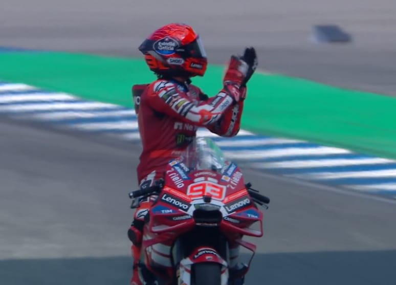 Nada más bajarse de la moto, Márquez no ocultó su carácter competitivo: «Aunque tenga experiencia y 33 años, soy competitivo y se ha visto. Y un poquito el ramalazo ese de volverse, de revolverse, pues no lo perdemos, que es muy importante». El de Cervera explicó que la caída de Marco Bezzecchi condicionó su planteamiento: «He decidido ir más lento de lo que se podía ir, porque he visto que la pista estaba muy crítica«.