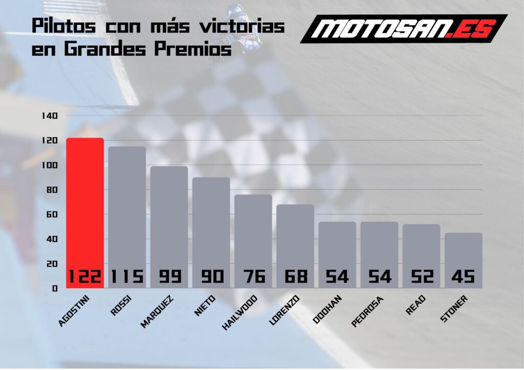 El italiano demostró un dominio absoluto en las temporadas 1968, 1969 y 1970, cuando disputó 58 Grandes Premios logrando la victoria en todos ellos. Su última victoria llegaría en 1976, en Alemania, de la mano de MV Agusta en la categoría de 500cc. Un año después, Agostini se retiró de la competición.