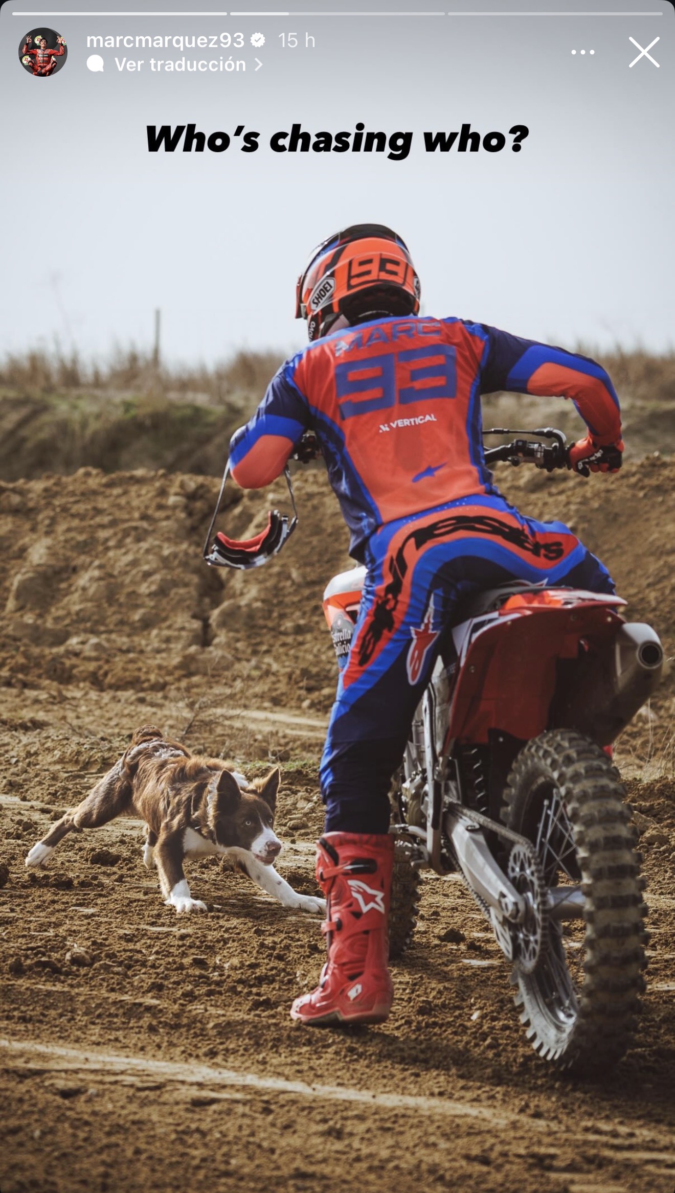 La sesión de entrenamiento también dejó algún momento más distendido fuera de la pista. En otra publicación, Marc mostró a su perro Turco jugando en la arena del circuito mientras él se preparaba para continuar con el entrenamiento del día.