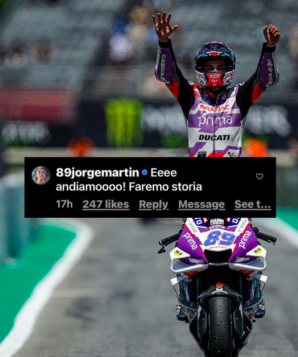 La otra cara de la moneda, Jorge Martín, seguirá formando parte de Ducati, pero en el Prima Pramac Racing. El piloto español seguirá compartiendo box con el piloto francés Johann Zarco, una temporada más. Martín también ha usado sus redes sociales para pronunciarse al conocer la noticia, «allá vamos, haremos historia«, escribía Martín en la publicación del Pramac que hacía oficial su continuidad en el equipo.