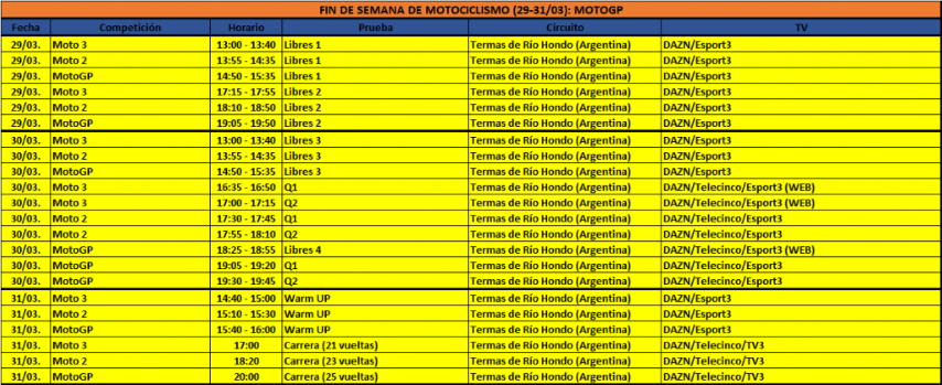 Los horarios del Gran Premio de Argentina serán vespertinos si lo miramos desde el punto de vista español. Tras la rueda de prensa de mañana, que tendrá lugar a las 4 de la tarde, el viernes será el turno de los primeros entrenamientos libres (13:00) y de los segundos (17:15). El sábado, después de los FP3, de nuevo desde la 1 de la tarde, vendrán, manteniendo el formato de doble fase, las clasificaciones de Moto 3 (Q1 a las 16:35 y Q2 a las 17:00), de Moto 2 (Q1 a las 17:30 y Q2 a las 17:55) y, finalmente, de MotoGP, a partir de las 19:05 de la tarde. El domingo, cuando habrá que habrá que adelantar los relojes una hora, a las 2 de la madrugada, después de los Warm UP (14:40) será el turno de las carreras: la categoría pequeña arrancará a las 17:00, la intermedia lo hará a las 18:20, y la reina a las 20:00.