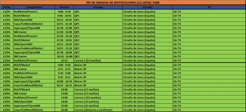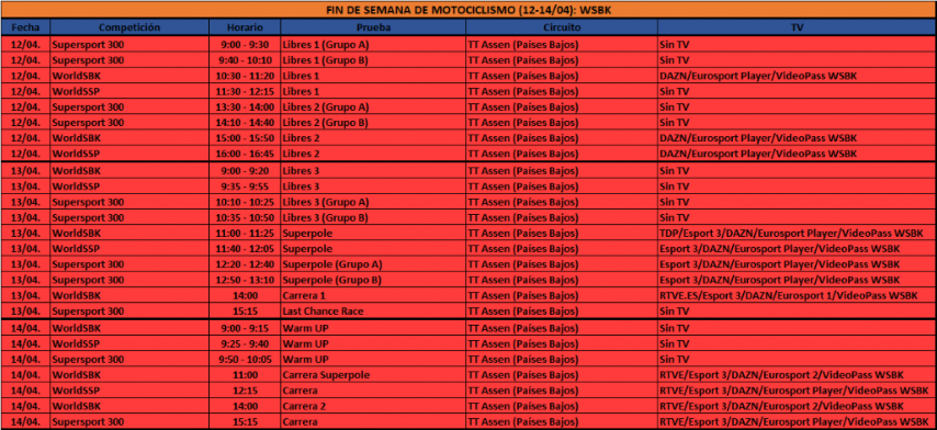 Los horarios serán los mismos que en Aragón, adaptados al formato básico para las carreras europeas. Tras los entrenamientos libres (el viernes, FP1 desde las 9 y FP2 desde las 13:30, y el sábado, FP3 desde las 9), llegarán las Superpoles (WSBK a las 11, WSSP a las 11:40 y SSP 300 a las 12:20) y las primeras carreras, esto es, la Race 1 de la categoría reina a las 2 y la carrera de repesca de SSP 300 a las 15:15. El domingo cerrarán la ronda otras 4 mangas: 2 de Superbikes, con la carrera sprint a las 11 y la Race 2 a las 2, WSSP a las 12:15 y Supersport 300 a las 15:15. Tanto Teledeporte y Esport 3 en abierto, como DAZN, Eurosport y el VideoPass de WSBK en el pago, se volcarán con la cuarta ronda del campeonato.