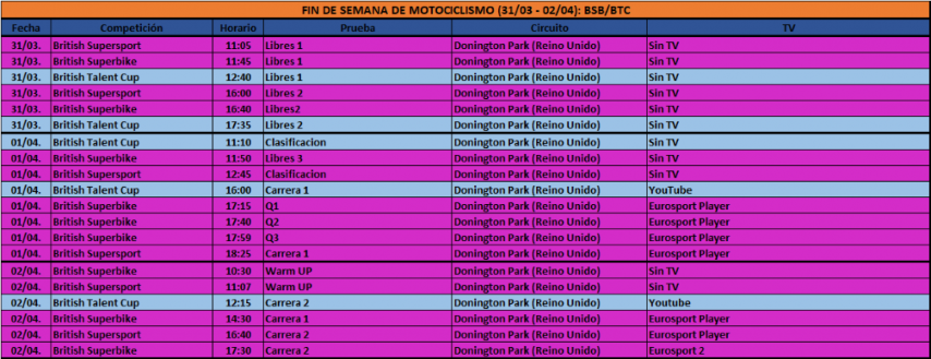 Llega un nuevo fin de semana, festivo por ser Semana Santa, y con él, más carreras. En esta ocasión, con el parón de MotoGP y con la reciente ronda de WSBK en Tailandia, los focos estarán centrados en Inglaterra. Allí, en el mítico trazado de Donington Park, el British Superbike dará por comenzada una nueva fase regular de su campeonato y la British Talent Cup correrá por primera vez.