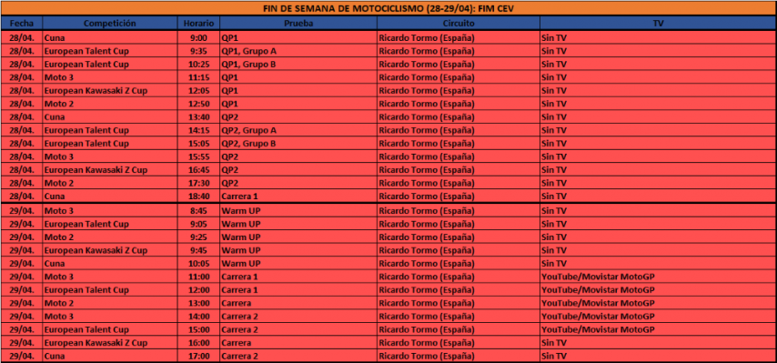 Así, le toca el turno al primer trazado español del año, que contará con un amplio número de carreras, al incorporarse a las categorías habituales las carreras de la Cuna de Campeones y de la European Kawasaki Z Cup. En este caso, serán dos para Moto 3 (11:00 y 14:00), para la European Talent Cup (12:00 y 15:00) y la Cuna (la única del sábado a las 18:40 y domingo a las 17:00), y una para Moto 2 (13:00) y la Kawasaki Z Cup (16:00).