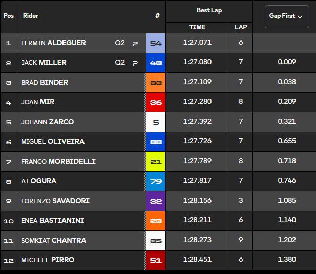 Jack Miller se colocaba segundo a falta de dos minutos del final. Finalmente, eran Aldeguer y Miller quienes pasaban a la Q2. El incidente entre Binder y Savadori será investigado por dirección de carrera.