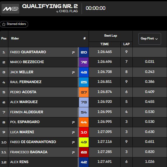 Entre ellos, Fabio Quartararo se colaba en primera posición en el último segundo, consiguiendo así la pole position. El francés compartirá línea de salida con Bezzecchi y Jack Miller. Finalmente, Pecco Bagnaia fu sancionado, y el piloto perdió tres posiciones en parrilla de salida: saldrá en decimocuarta posición en la carrera del domingo.