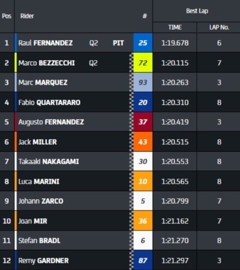 El segundo ‘run’ ha comenzado con Raúl Fernández en lo más alto de la tabla, seguido por Marc Márquez. Los pilotos han vuelto a salir en grupo, rodando lento para encontrar una rueda que seguir. A falta de tres minutos para el final, Marc Márquez regresaba a boxes; al tiempo que Raúl Fernández bajaba el registro hasta 1:19.678. Bezzecchi mejoraba poco después, echando a Márquez de la Q2.