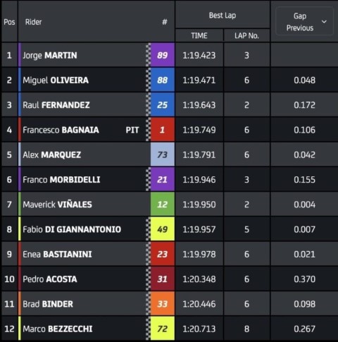 Ya con el cronómetro a cero, Alex Márquez se iba al suelo, zanjando la sesión de Q2. Finalmente, Jorge Martín saldrá desde la pole, con Miguel Oliveira y Raúl Fernández completando la primera fila. Pecco Bagnaia abrirá la segunda desde la cuarta posición, con Alex Márquez quinto y Franco Morbidelli sexto. Viñales saldrá séptimo; mientras que Pedro Acosta no ha podido mejorar la décima posición.